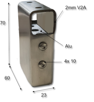 INOX V2A, 70 x 60 x 23mm / 2mm dick